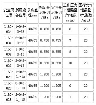 針對受熱變形泄漏問題,經(jīng)反復(fù)比較試驗,改進了原安全閥密封結(jié)構(gòu),將閥瓣與導(dǎo)向塊連成一體,將錐面密封改為平面密封,增加了閥瓣厚度,并在閥座和閥瓣的密封面上堆焊鈷基硬質(zhì)合金,以提高密封面的耐溫性能和表面硬度,解決了受熱變形泄漏問題,改進后的閥瓣結(jié)構(gòu)見圖1b。根據(jù)成套設(shè)備的安裝尺寸及性能參數(shù),首批試制了2個品種、3個規(guī)格共7臺平面密封安全閥,適用介質(zhì)為聯(lián)苯加聯(lián)苯醚,工作溫度小于或等于330 ℃,開啟壓力分別為0.45MPa、0.55MPa和1.2MPa。安裝于某生產(chǎn)線上連續(xù)試用123天,停產(chǎn)檢修時拆下進行開啟壓力和密封性檢驗,結(jié)果見表1。表中數(shù)據(jù)說明,試用的這批安全閥,開啟壓力和密封性能均達到國家標準規(guī)定的優(yōu)質(zhì)品要求。