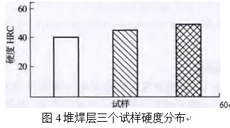 三個試樣硬度分析結(jié)果如圖4所示。由于鎳基堆焊合金層存在較高的cr,會形成更多化合物相,且其組織細小均勻,硬度較高,滿足耐磨性的要求。